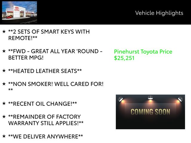 Advertised prices exclude taxes, DMV fees, $249 electronic tag fee and $798 dealer fee. All vehicle pricing is subject to change. Time to time in the transfer of data on the internet there are errors, and the dealer is not responsible for errors in advertised price. Prices include all incentives and rebates. All sale prices applicable on day of sale and not in conjunction with any other offers, specials, or sales events. Must finance with SETF at standard rates with approved credit. Advertised prices cannot be used in conjunction with special factory APR programs. Discounts available on in-stock units only. Pinehurst Toyota is not responsible for typographical errors. Stock numbers designate sale vehicles. Art for illustration purposes only. See dealer for complete details.