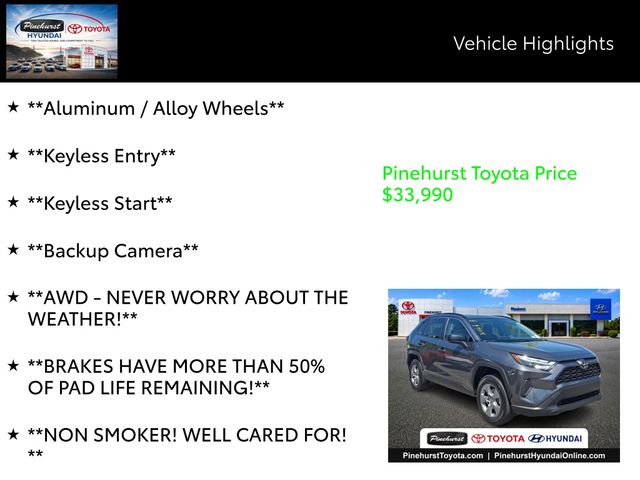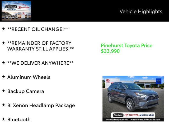 Advertised prices exclude taxes, DMV fees, $249 electronic tag fee and $798 dealer fee. All vehicle pricing is subject to change. Time to time in the transfer of data on the internet there are errors, and the dealer is not responsible for errors in advertised price. Prices include all incentives and rebates. All sale prices applicable on day of sale and not in conjunction with any other offers, specials, or sales events. Must finance with SETF at standard rates with approved credit. Advertised prices cannot be used in conjunction with special factory APR programs. Discounts available on in-stock units only. Pinehurst Toyota is not responsible for typographical errors. Stock numbers designate sale vehicles. Art for illustration purposes only. See dealer for complete details.