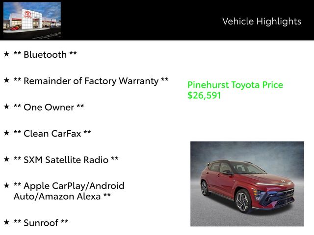 This Kona N Line is a true gem, with a clean CARFAX history and the remainder of the factory warranty still in effect. Meticulously maintained and cared for by its previous owner, this vehicle is ready to provide you with years of reliable and enjoyable driving.