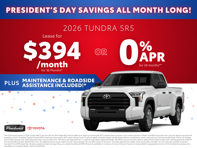 Advertised prices exclude taxes, DMV fees, and $798 dealer fee. All vehicle pricing is subject to change. Time to time in the transfer of data on the internet there are errors, and the dealer is not responsible for errors in advertised price. Prices include all incentives and rebates. All sale prices applicable on day of sale and not in conjunction with any other offers, specials, or sales events. Must finance with SETF at standard rates with approved credit. Advertised prices cannot be used in conjunction with special factory APR programs. Discounts available on in-stock units only. Pinehurst Toyota is not responsible for typographical errors. Stock numbers designate sale vehicles. Art for illustration purposes only. See dealer for complete details.