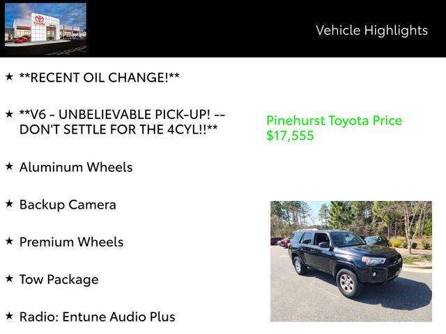 This Toyota's impressive features don't stop there. The Entune Premium Audio system with navigation provides cutting-edge connectivity and entertainment, while the spacious interior and versatile cargo area make it perfect for hauling gear or transporting the whole family. With a sleek black exterior and premium alloy wheels, this 4Runner looks as good as it performs.