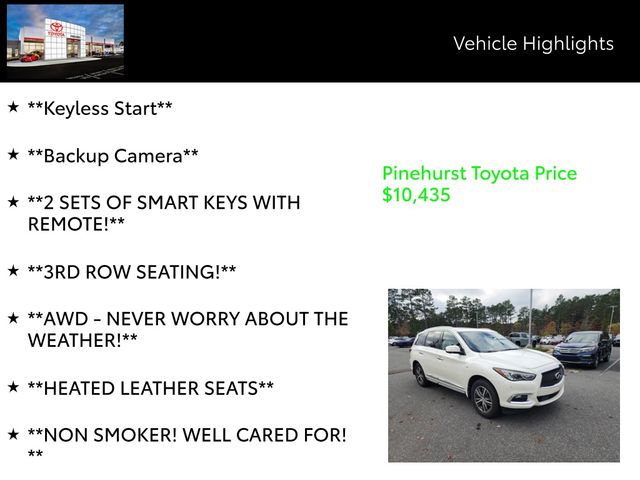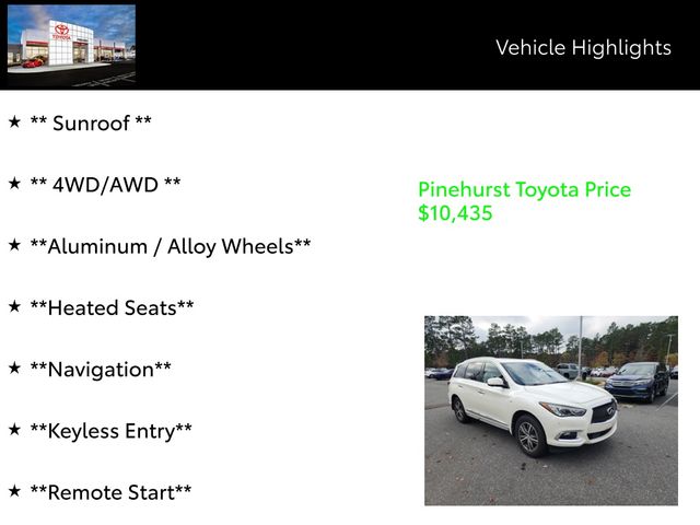 Designed with your comfort and convenience in mind, the QX60 Base offers ample cargo space and a versatile 3rd-row seating configuration, making it the perfect companion for family adventures or weekend getaways. The Premium Plus Package and Premium Package further elevate your driving experience, with features like a heated steering wheel, driver's seat memory settings, and a power liftgate.