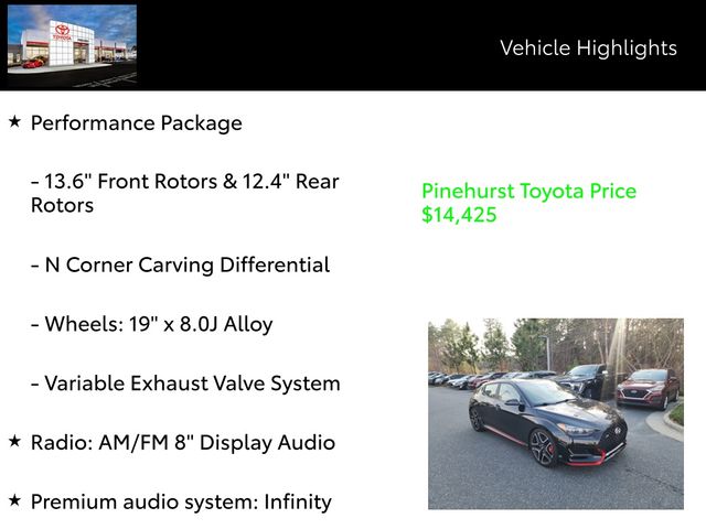 - Performance Package: Includes Tires: 235/35R19 Summer, Wheels: 19" x 8.0J Alloy, Engine: 2.0L Turbo GDI 4-Cylinder, Variable Exhaust Valve System, Transmission: 6-Speed Manual w/Rev-Matching, hillstart assist control and N Grin Control System drive mode selection system, N Corner Carving Differential, Limited slip differential w/electronic control, 13.6" Front Rotors & 12.4" Rear Rotors, Front and rear ventilated