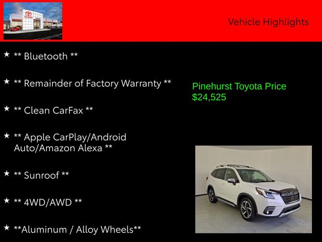 With a clean CarFax and the remainder of the factory warranty still in effect, this Forester Touring is a smart choice for those seeking a reliable, feature-rich, and versatile SUV. Whether you're navigating the daily commute or embarking on your next adventure, the 2022 Subaru Forester Touring is ready to exceed your expectations.