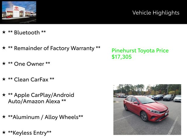 Elevate your driving experience with this exceptional 2023 Kia Forte LXS. This well-maintained, one-owner vehicle boasts a captivating Currant Red exterior and an array of premium features that will elevate your daily commute.