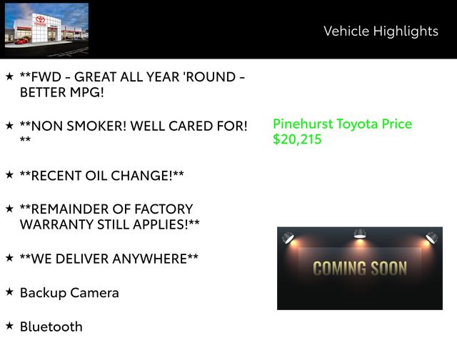 Advertised prices exclude taxes, DMV fees, and $798 dealer fee. All vehicle pricing is subject to change. Time to time in the transfer of data on the internet there are errors, and the dealer is not responsible for errors in advertised price. Prices include all incentives and rebates. All sale prices applicable on day of sale and not in conjunction with any other offers, specials, or sales events. Must finance with SETF at standard rates with approved credit. Advertised prices cannot be used in conjunction with special factory APR programs. Discounts available on in-stock units only. Pinehurst Toyota is not responsible for typographical errors. Stock numbers designate sale vehicles. Art for illustration purposes only. See dealer for complete details.
