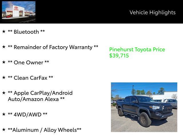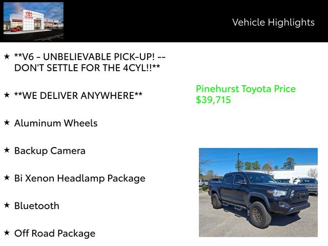 Featuring a meticulously curated list of premium features, this Tacoma Trail Edition is equipped to elevate your driving experience. Enjoy the convenience of - Bluetooth, Apple CarPlay/Android Auto/Amazon Alexa, 4WD/AWD, Aluminum/Alloy Wheels, Keyless Entry, Backup Camera, and much more. The powerful 3.5L V6 engine and 6-speed transmission deliver unparalleled performance, ensuring you'll never be left wanting for power.