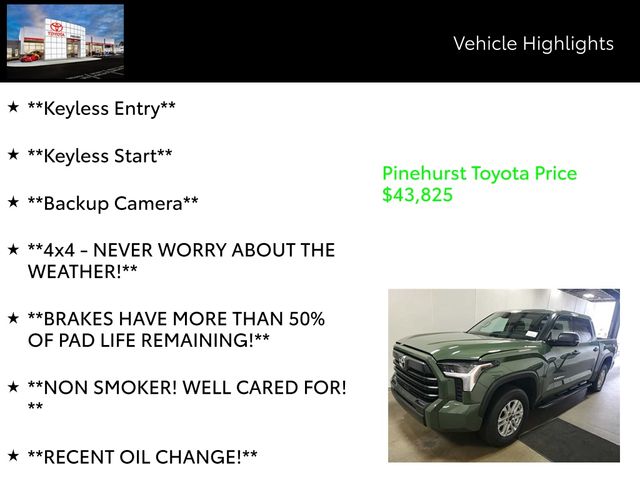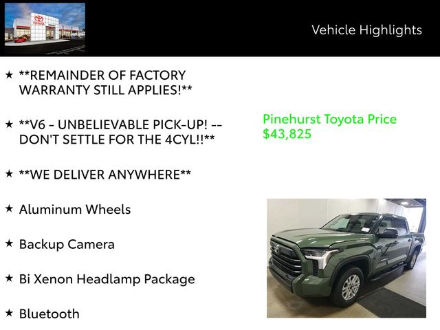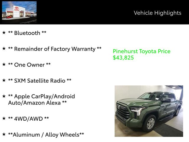 Elevate your driving experience with this exceptional 2023 Toyota Tundra SR5. This powerful and versatile truck is equipped with a robust 3.4L V6 engine paired with a seamless 10-Speed Automatic transmission, delivering exceptional performance and efficiency. Boasting a striking Green exterior, this Tundra SR5 is not only visually stunning but also built to handle any terrain with its capable 4WD system.