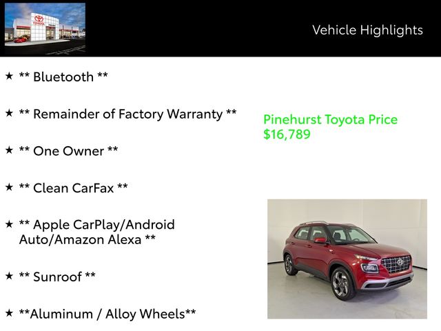 As a Hyundai Certified Used Vehicle, this Venue SEL has undergone a rigorous 173+ point inspection and comes with a comprehensive warranty package, including a 60-month/60,000-mile Limited Warranty and a 120-month/100,000-mile Powertrain Limited Warranty. You'll also enjoy 10-year/Unlimited Mileage Roadside Assistance, a 3-month SiriusXM trial subscription, and a complimentary 1-year Connected Care & Remote Package.