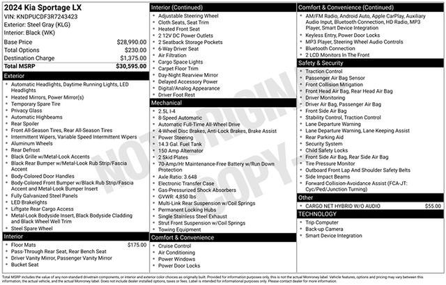 The 2024 Kia Sportage LX is a versatile and well-equipped compact SUV that delivers an exceptional driving experience. With its sleek design, advanced features, and impressive capabilities, this Sportage is the perfect choice for those seeking a vehicle that seamlessly blends style, comfort, and performance.