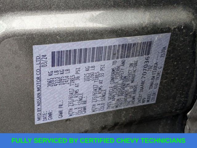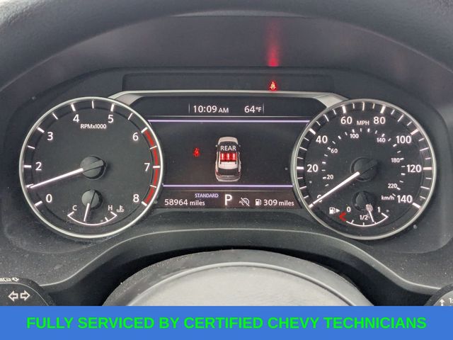 17" Aluminum Alloy Wheels, 4 Speakers, 4-Wheel Disc Brakes, 5.676 Axle Ratio, ABS brakes, Air Conditioning, Alloy wheels, AM/FM radio: SiriusXM, Auto High-beam Headlights, Blind Spot Warning, Brake assist, Bumpers: body-color, Cloth Seat Trim, Delay-off headlights, Driver door bin, Driver vanity mirror, Dual front impact airbags, Dual front side impact airbags, Electronic Stability Control, Four wheel independent suspension, Front anti-roll bar, Front Bucket Seats, Front Center Armrest, Front reading lights, Fully automatic headlights, Illuminated entry, Knee airbag, Low tire pressure warning, NissanConnect featuring Apple CarPlay and Android Auto, Occupant sensing airbag, Outside temperature display, Overhead airbag, Overhead console, Panic alarm, Passenger door bin, Passenger vanity mirror, Power door mirrors, Power steering, Power windows, Radio data system, Radio: AM/FM NissanConnect, Rear anti-roll bar, Rear Parking Sensors, Rear seat center armrest, Rear side impact airbag, Rear window defroster, Rear window wiper, Remote keyless entry, Speed control, Speed-Sensitive Wipers, Split folding rear seat, Spoiler, Steering wheel mounted audio controls, Tachometer, Telescoping steering wheel, Tilt steering wheel, Traction control, Trip computer, Variably intermittent wipers.