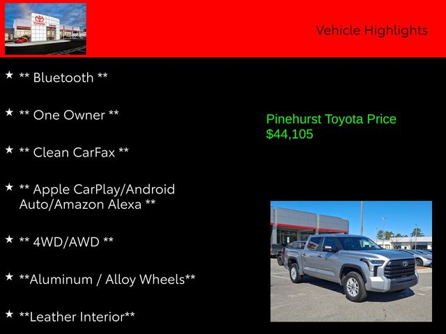 Advertised prices exclude taxes, DMV fees, and $798 dealer fee. All vehicle pricing is subject to change. Time to time in the transfer of data on the internet there are errors, and the dealer is not responsible for errors in advertised price. Prices include all incentives and rebates. All sale prices applicable on day of sale and not in conjunction with any other offers, specials, or sales events. Must finance with SETF at standard rates with approved credit. Advertised prices cannot be used in conjunction with special factory APR programs. Discounts available on in-stock units only. Pinehurst Toyota is not responsible for typographical errors. Stock numbers designate sale vehicles. Art for illustration purposes only. See dealer for complete details.