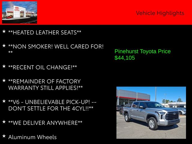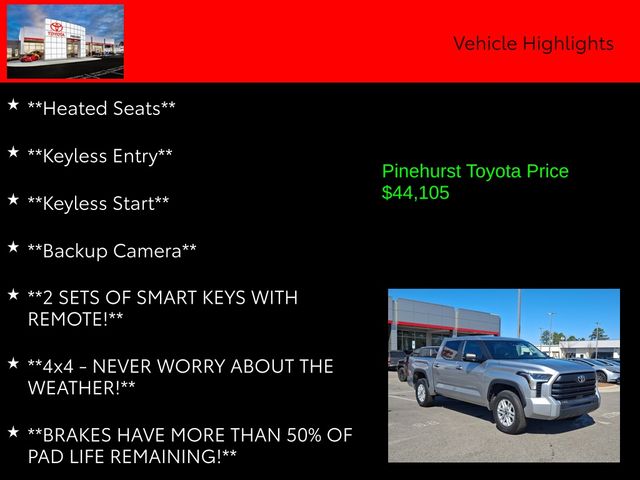 This Tundra also comes equipped with the SR5 Convenience Package, which includes a Blind Spot Monitor with Lane Change Assist, a 32-gallon fuel tank, and Parking Support Alert/Brake. The SR5 Premium Package adds dual-zone automatic climate control, 8-way power-adjustable heated front seats, and 2-way power-adjustable lumbar support.