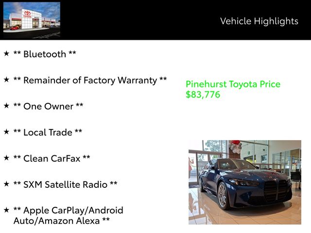 Elevating the driving experience, this M3 is equipped with the Executive Package, featuring a Power Tailgate, Full LED Headlights with Cornering Lights, BMW Curved Display with HUD, and a Heated Steering Wheel. The Parking Assistance Package, including Parking Assistant Plus, ensures effortless maneuverability, while the M Drive Professional system allows you to customize your driving dynamics with the touch of a button.