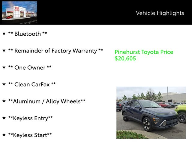 This well-maintained Kona has been meticulously cared for, as evidenced by its clean CARFAX report and recent oil change. With just 24,296 miles on the odometer, this vehicle has plenty of life left to offer, making it an exceptional value in the pre-owned market.