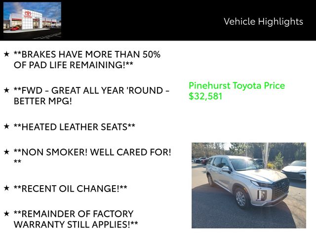 With its exceptional condition, low mileage, and the remainder of the factory warranty still in effect, this 2025 Hyundai Palisade SEL represents an unbeatable value. Don't miss the opportunity to experience the perfect blend of style, performance, and technology. Schedule a test drive today and discover the Palisade's unparalleled capabilities for yourself.