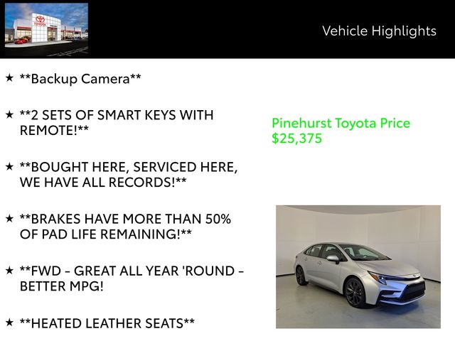 This Toyota Corolla XSE is more than just a practical daily driver – it's a true driving companion. Indulge in the comfort of the heated leather seats, enjoy the convenience of the keyless entry and start, and stay connected with the state-of-the-art infotainment system. The sunroof adds a touch of open-air freedom, while the backup camera ensures confident maneuvering.