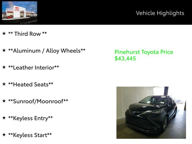 Boasting a spacious and versatile interior, the Sienna XLE is the perfect companion for your growing family or active lifestyle. With its 2.5L I4 Hybrid engine, you'll enjoy an impressive 36 MPG in the city and on the highway, making it an exceptional choice for your daily commute or cross-country adventures.