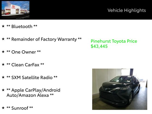 This one-owner Sienna XLE with a clean CARFAX report is a rare find. Backed by the remainder of the factory warranty, this meticulously maintained vehicle is ready to provide you with years of reliable and enjoyable driving. Experience the exceptional value and peace of mind that comes with this exceptional Toyota minivan. Visit our showroom today to take this Sienna XLE for a test drive and discover the perfect vehicle for your lifestyle.