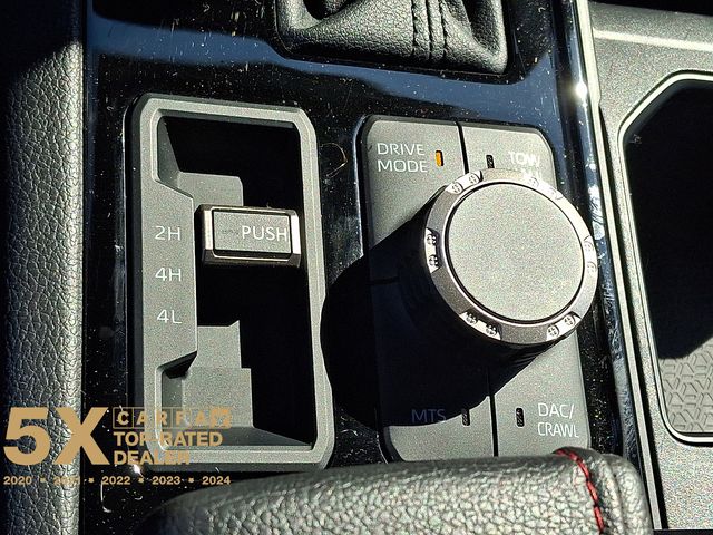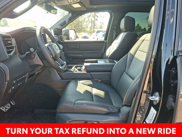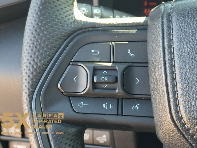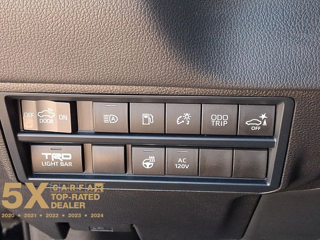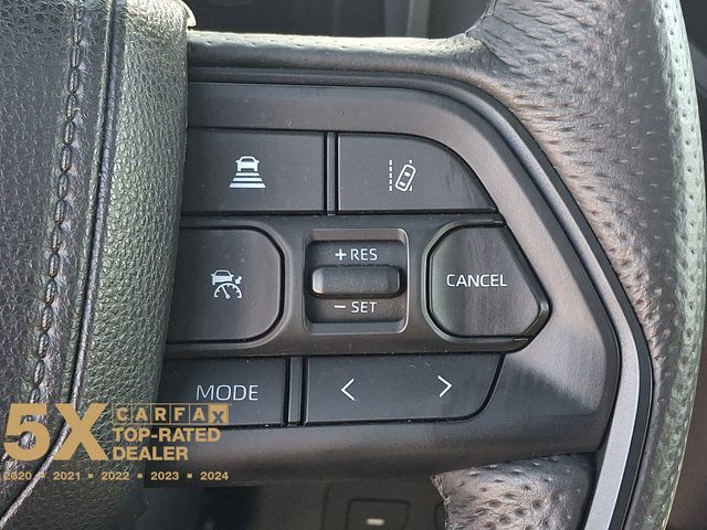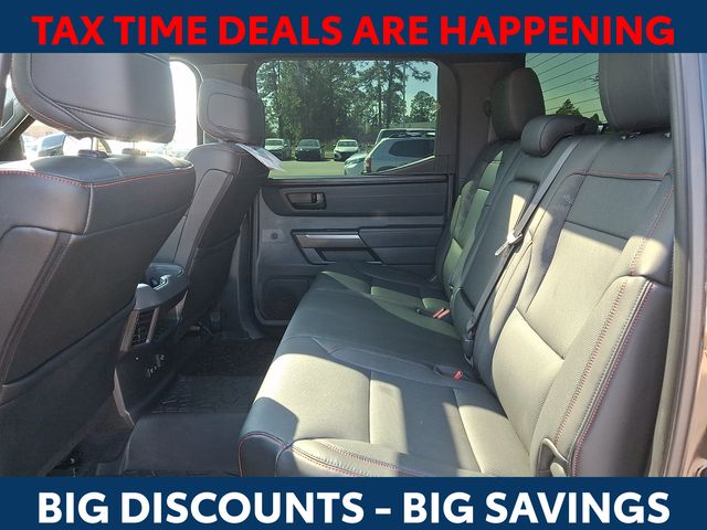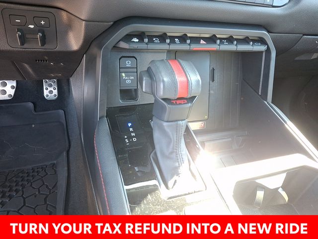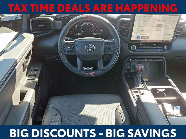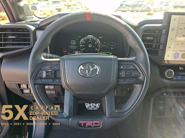 Inside, the Tundra Hybrid TRD Pro pampers you with a host of premium features, including Navigation, 12 Speakers, AM/FM radio: SiriusXM, Radio data system, Radio: Premium Audio w/JBL, Air Conditioning, Automatic temperature control, Front dual zone A/C, Rear window defroster, Memory seat, Power driver seat, Power steering, Power windows, Remote keyless entry, Steering wheel mounted audio controls, Power moonroof, Exterior Parking Camera Rear, Auto High-beam Headlights, Delay-off headlights, Front fog lights, Fully automatic headlights, Apple CarPlay/Android Auto, Auto-dimming Rear-View mirror, Garage door transmitter: HomeLink, Heated steering wheel, Illuminated entry, Leather Shift Knob, Leather steering wheel, Front Bucket Seats, Front Center Armrest, Heated & Ventilated Front Bucket Seats, Heated front seats, Power passenger seat, SofTex Seat Trim, Split folding rear seat, Ventilated front seats, and Alloy wheels.