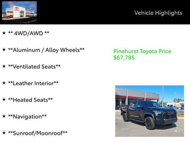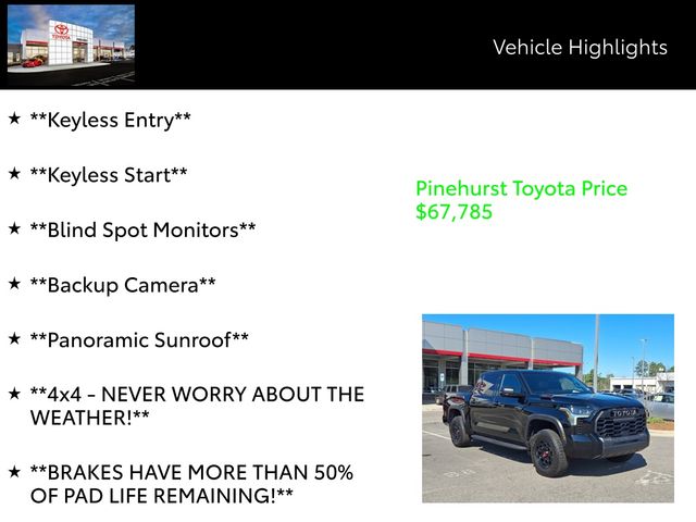 Meticulously equipped, this Tundra Hybrid TRD Pro offers an impressive array of features, including - Bluetooth, Remainder of Factory Warranty, One Owner, Clean CarFax, SXM Satellite Radio, Apple CarPlay/Android Auto/Amazon Alexa, Sunroof, 4WD/AWD, Aluminum / Alloy Wheels, Ventilated Seats, Leather Interior, Heated Seats, Navigation, Sunroof/Moonroof, Keyless Entry, Keyless Start, Blind Spot Monitors, Backup Camera, Panoramic Sunroof, 4x4 - NEVER WORRY ABOUT THE WEATHER!, BRAKES HAVE MORE THAN 50% OF PAD LIFE REMAINING!, HEATED AND COOLED LEATHER SEATS, NON SMOKER! WELL CARED FOR!, RECENT OIL CHANGE!, REMAINDER OF FACTORY WARRANTY STILL APPLIES!, V6 - UNBELIEVABLE PICK-UP! -- DON'T SETTLE FOR THE 4CYL!!, 360-DEGREE SURROUND-VIEW CAMERA SYSTEM, Aluminum Wheels, BLIND-SPOT MONITORING, Backup Camera, Bi Xenon Headlamp Package, Leather Seats, Moonroof, Navigation System, Off Road Package, Premium Wheels, Sunroof/Moonroof, and Tow Package.
