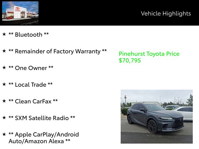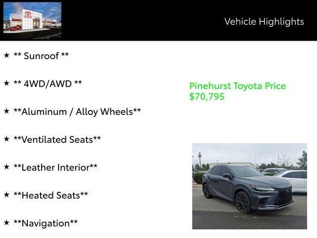 Meticulously equipped with a host of premium features, this RX 500h F SPORT Performance is a true standout in its class. Key highlights include - Bluetooth, Remainder of Factory Warranty, One Owner, Local Trade, Clean CarFax, SXM Satellite Radio, Apple CarPlay/Android Auto/Amazon Alexa, Sunroof, 4WD/AWD, Aluminum / Alloy Wheels, Ventilated Seats, Leather Interior, Heated Seats, Navigation, Premium Audio Package, Sunroof/Moonroof, Keyless Entry, Keyless Start, Backup Camera, and 2 SETS OF SMART KEYS WITH REMOTE.